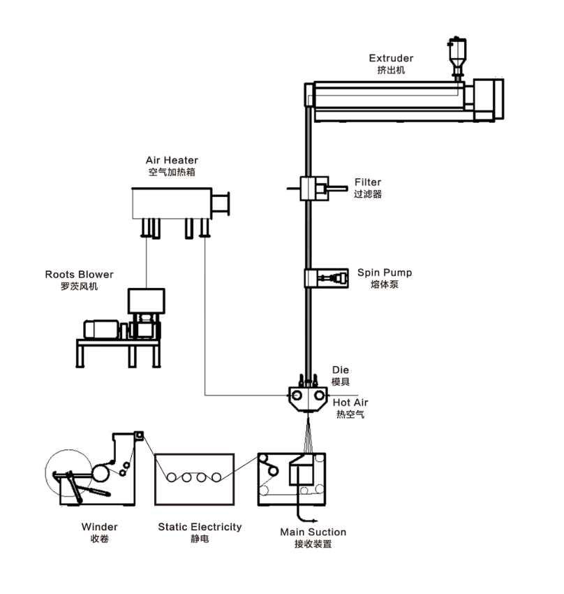 熔噴雙柱液壓換網(wǎng)器被應(yīng)用于熔噴布生產(chǎn)線中,其作用是:將熔體中的雜質(zhì)過濾掉,以免堵塞噴絲孔。