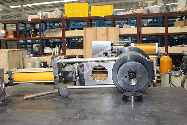 熔體過濾不停機換網(wǎng)器,滑板上設(shè)計兩個可拆卸式的過濾工位,工作時,一個過濾工位在主體內(nèi)部進(jìn)行熔體的過濾,另一個工位在主體外部備用(滑板上設(shè)有不銹鋼加熱棒進(jìn)行加熱保溫,保證和生產(chǎn)溫度的相近)。當(dāng)工作中過濾網(wǎng)上的雜質(zhì)積累到一定程度時,需要換網(wǎng),即可按動液壓站上的操作手柄按鈕,啟動蓄能液壓站進(jìn)行換網(wǎng)動作。